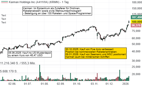 Im US-Musterdepot von TraderFox setzen wir seit dem 05.06.2025 zu einem Kurs von 45,47 USD auf Karman. Der Buchgewinn: 120 %! Karman hat sich als ein führender "Tier-1"-Zulieferer in den Bereichen Luft- und Raumfahrt sowie Verteidigung etabliert. Das Kerngeschäft konzentriert sich auf die Entwicklung und Fertigung von hochkomplexen Verbundwerkstoffen, metallischen Komponenten und Subsystemen, die dort zum Einsatz kommen, wo Materialversagen keine Option ist – von strukturellen Elementen für Trägerraketen bis hin zu thermischen Schutzsystemen für Hyperschallraketen. An über 130 Programmen wirkt Karman mit.