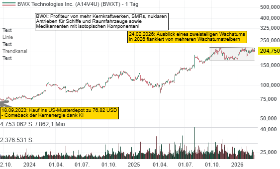 Für 2026 prognostiziert das Management einen Umsatzanstieg auf rund 3,75 Milliarden USD (ca. +17 %). Das EPS soll auf 4,55 bis 4,70 USD (ca. +15 %) steigen. Trotz Investitionen in neue Fertigungskapazitäten, wie etwa die mögliche Erweiterung in Mount Vernon zur Bedienung des zivilen Marktes, erwartet BWXT eine Margenverbesserung und einen starken Free Cash Flow von über 300 Millionen USD. Das Übertreffen des Konsens auch beim Ausblick sollte einen weiteren Aufschwung der Aktie begünstigen.