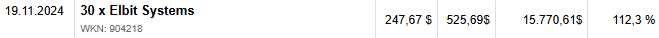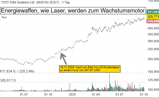die Luftraumverletzungen durch Drohnen in Polen und Dänemark sowie die neusten Sichtungen von Spionage-Drohnen in Deutschland über dem Münchner Flughafen, über Raffinerien und Klinken in Schleswig-Holstein werden die Investitionen in Abwehrlösungen intensivieren. Auf EU-Ebene wurde der neue "Drohnenwall" bereits zur Priorität gemacht. Mit diesem sollen Drohnen kostengünstiger vom Himmel geholt werden können. Der Einsatz von Jets oder Raketen im Kostenbereich von Millionen an Euro sind zu ineffizient. Im US-Musterdepot haben wir mit Elbit Systems einen potenziellen Profiteur, auf den wir seit dem 19.11.2024 zu 247,67 USD setzen – es ist der neuste 100%ter!