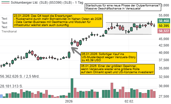 Ende 2025 und Anfang 2026 haben wir im US-Musterdepot die Positionierung bei Value-Aktien verstärkt. Technologie-Werte waren zu teuer. Wir haben eine breitere Diversifikation angestrebt und folgten bevorzugt neuen Pivotal News Points. Einer ist die neue Öl-Story in Venezuela, denn die USA planen die tägliche Ölförderung dort von 0,8 bis 1 Mio. Barrel pro Tag auf 2 bis 2,5 Mio. Barrel pro Tag zu steigern. Eine sehr gute Perspektive für Ölfeldservice-Unternehmen resultiert daraus. Wir kauften uns sofort bei Schlumberger ein!